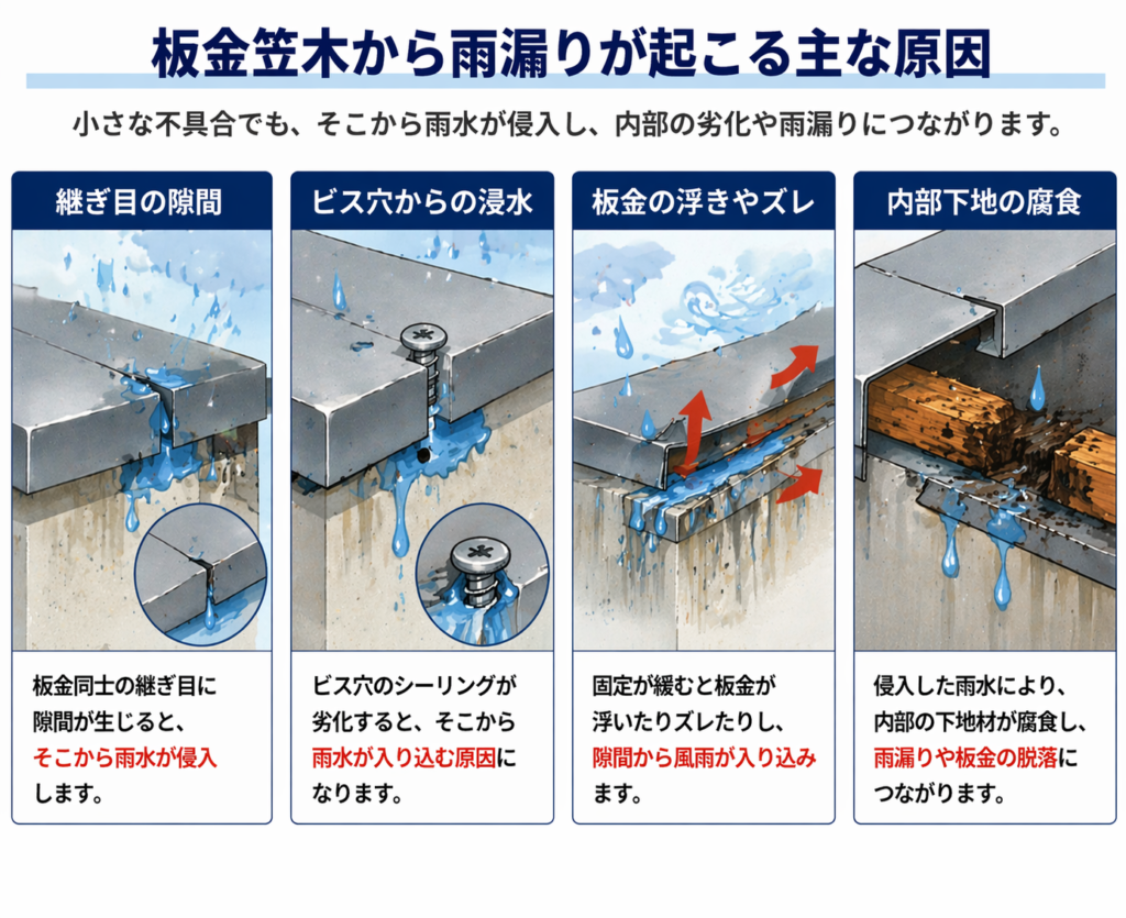 代表的な原因としては、「継ぎ目の隙間」「ビス穴からの浸水」「板金の浮きやズレ」「内部下地の腐食」などが挙げられます。