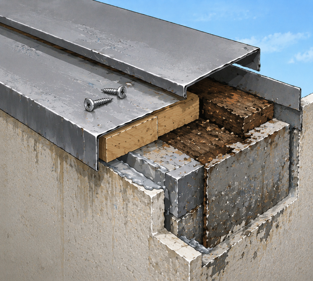 特に板金製の笠木は耐久性に優れ、現在の住宅でも多く採用されていますが、固定部の劣化や内部の腐食が進行すると、見えない部分から雨水が侵入し、気付かないうちに雨漏りにつながるケースも少なくありません。