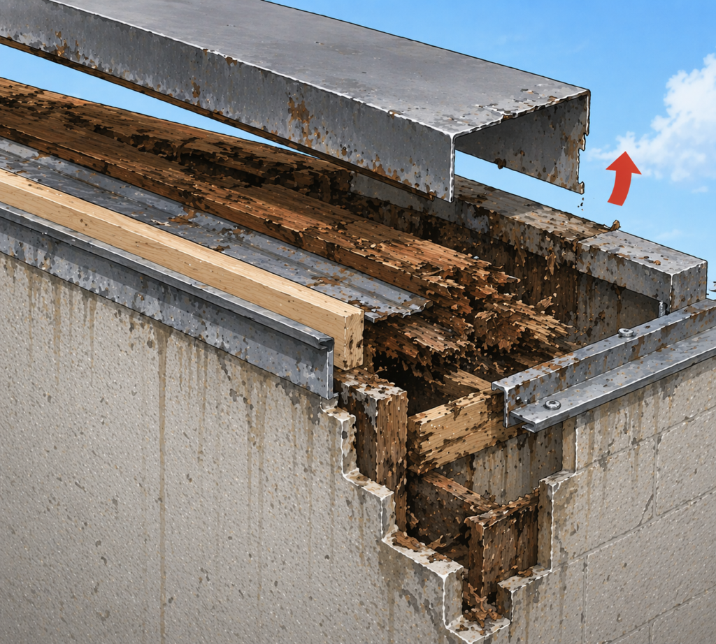 さらに、板金の浮きやズレも大きな原因の一つです。強風や経年劣化によって板金が浮くと、本来雨水が入り込まない構造が崩れ、内部へ直接水が入り込む状態になります。
