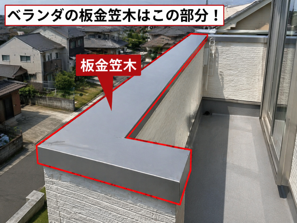 笠木とは、ベランダやバルコニー、屋上などの立ち上がり壁の最上部に取り付けられる仕上げ材のことで、建物内部へ雨水が侵入するのを防ぐ非常に重要な役割を担っています。