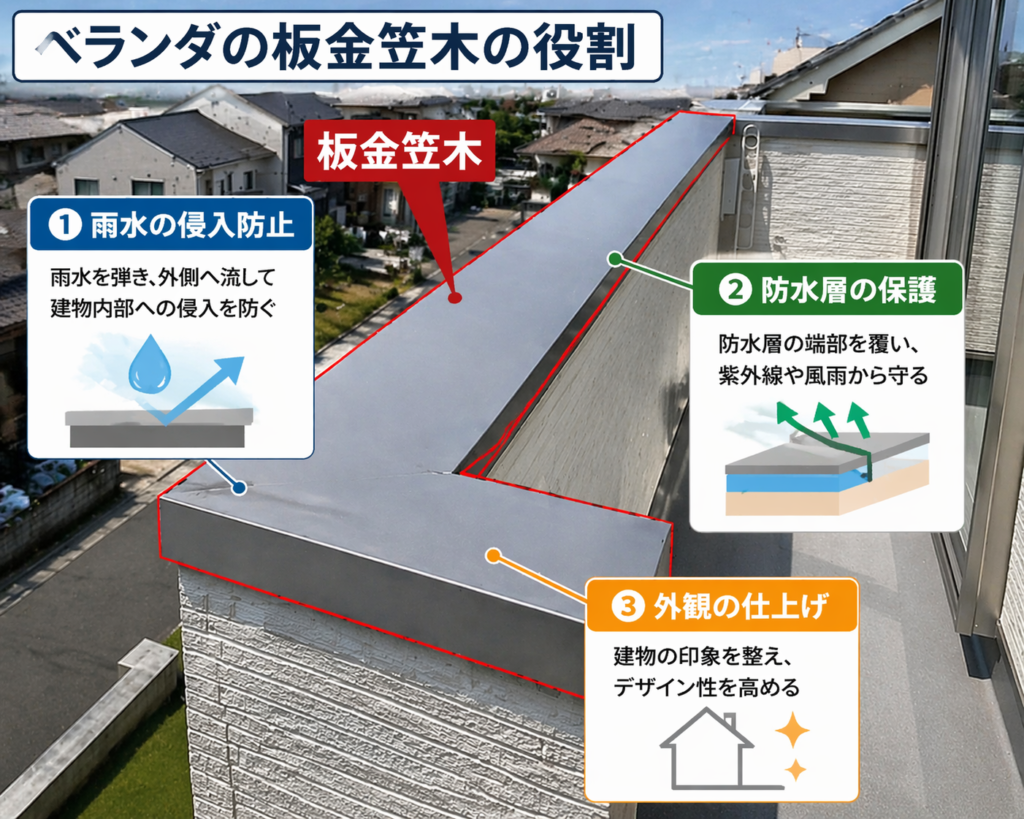 笠木は、ベランダやバルコニー、屋上の立ち上がり部分の上部に取り付けられている仕上げ材であり、雨水の侵入を防ぐ重要な役割を担っています。