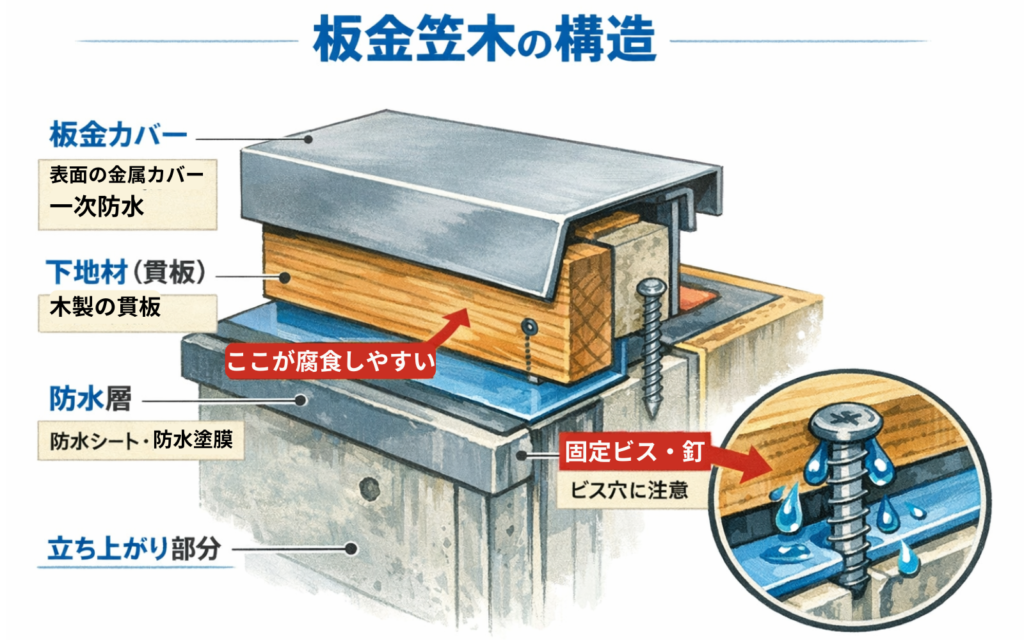 板金笠木は、表面に見えている金属部分だけで構成されているわけではなく、複数の部材が組み合わさることで防水性能を維持しています。