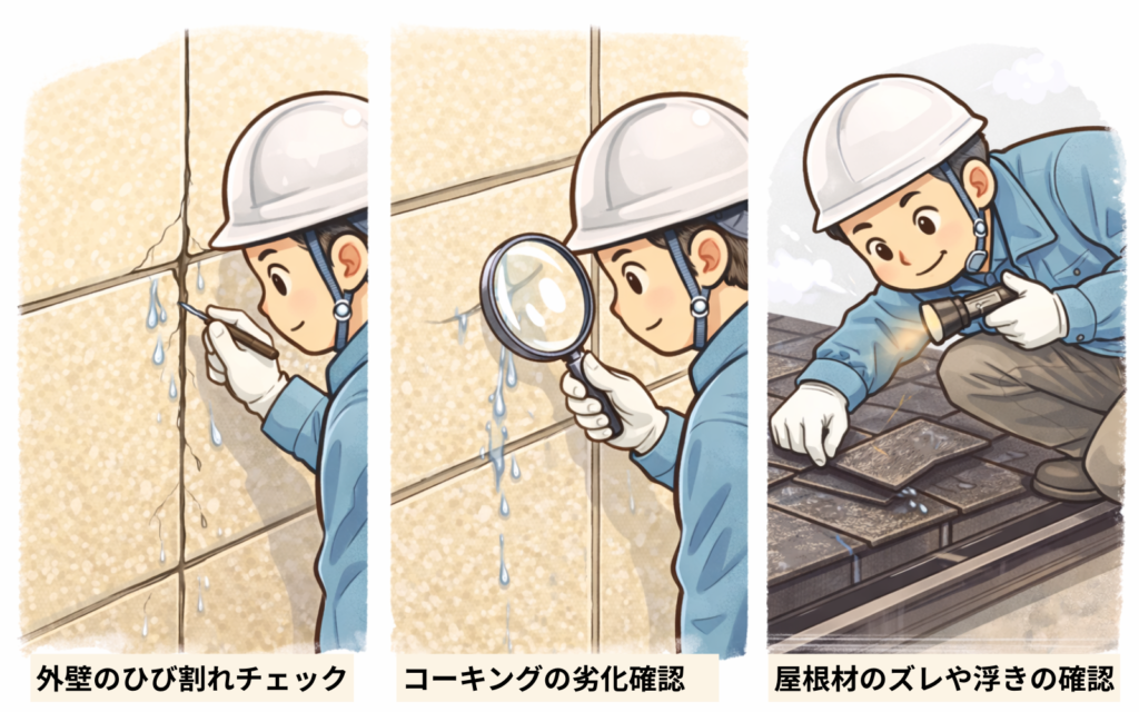 特にコーキングは防水の要となる部分であり、ひび割れや硬化が見られる場合は早めの対応が必要です。