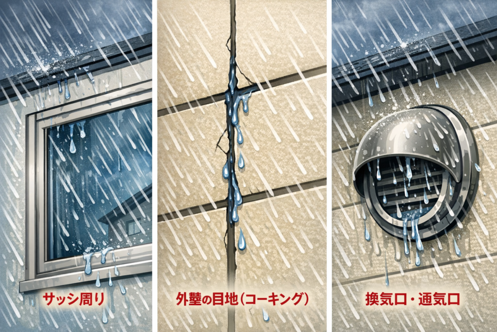 これらの箇所は、防水処理が施されているものの、あくまで「通常の雨」を想定した設計です。