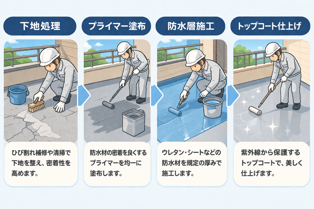 防水工事は、同じ工法であっても、下地の状態や劣化の進行具合によって必要な工程が大きく変わります。