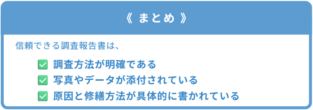 見積もり金額だけで業者を選ぶのではなく、「 信頼できる調査報告書 」をしっかり見極めることが重要です。