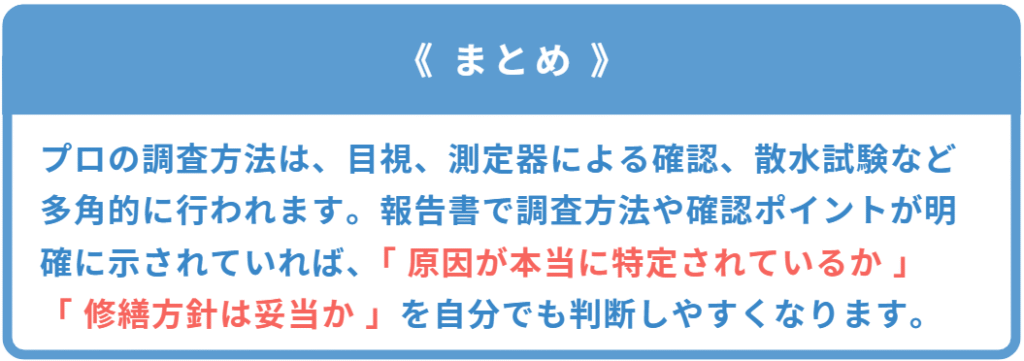 信頼できる業者が作成したプロの調査報告書は、単なる書類ではなく、水の浸入経路を特定する「 決定的な証拠 」であり、無駄な費用をかけずに修理を成功させるための設計図です。