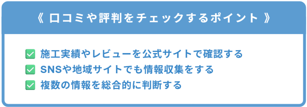 サクラや競合他社による作為的な投稿が混じっている可能性があるため、複数のサイトで内容が一致しているか、具体的な工事内容に触れているかなど、信憑性を慎重に見極めましょう。