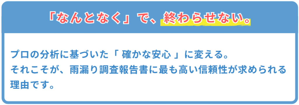 そんなとき、「 不安を納得 」に変える唯一の証拠となるのが、専門家による雨漏り調査報告書です。