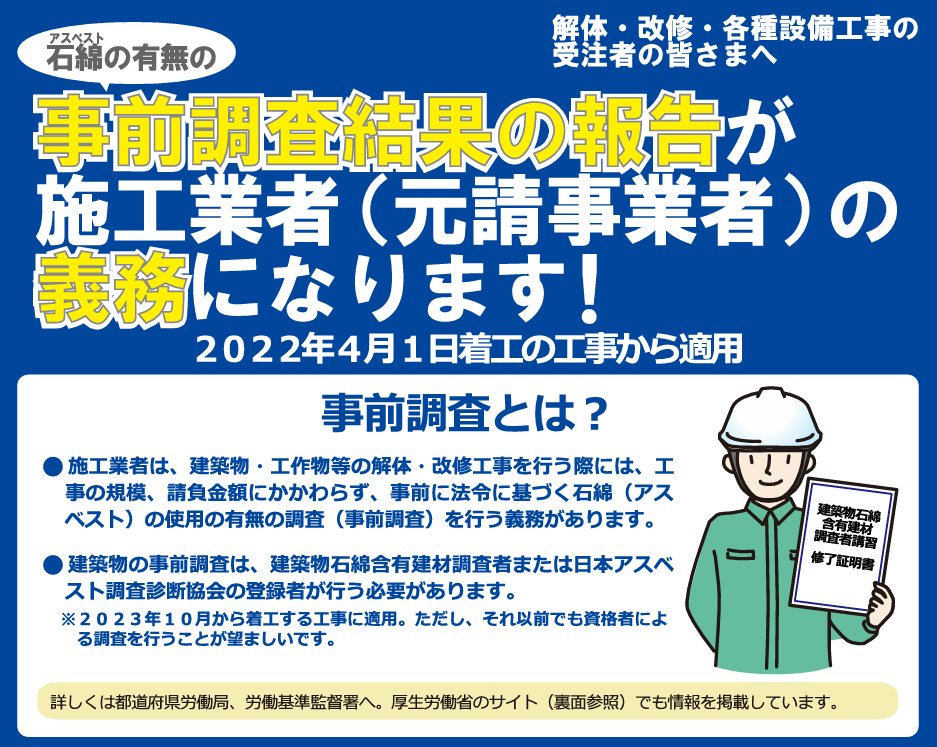 建築物の石綿含有建材の有無を調べる事前調査について、2023年10月以降、調査の質の確保を目的として「 建築物石綿含有建材調査者 」などの専門資格者による実施が法令で義務化されました。