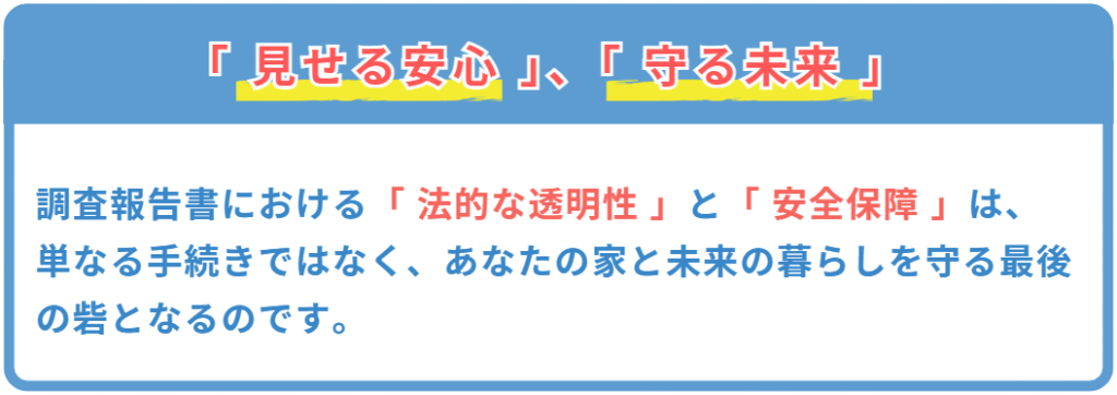 雨漏りの調査報告書は、単に修理の設計図であるだけでなく、あなたの住まいとご家族を法的なリスクと将来の不安から守るための 大切な公的記録でもあります。