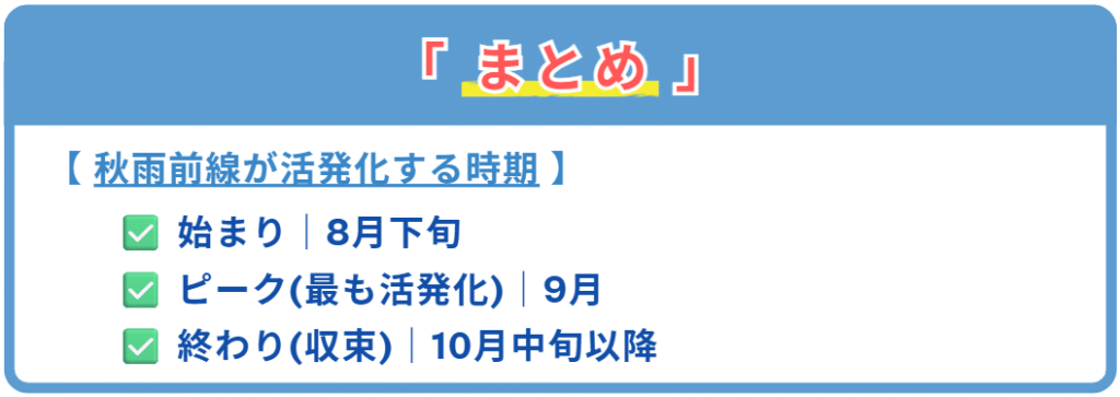 秋雨前線の活動は、一般的に10月中旬以降になると 日本列島から離れ、収束に向かいます。