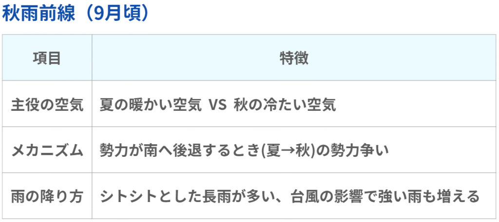 秋雨前線と梅雨前線は、長雨を引き起こす主役の空気と、その空気の勢力争いが起きる場所(時期)が違います。