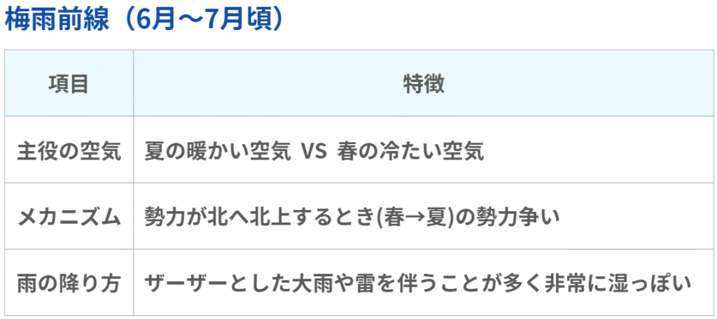しかし、この2つの前線は、発生のメカニズム、時期、そして雨の降り方においても決定的な違いがあります。