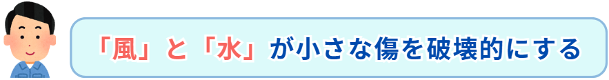 特に金属製の外壁やサイディング材が浮いていたり、剥がれかかっていたりすると、強風で一気に破損する可能性があります。