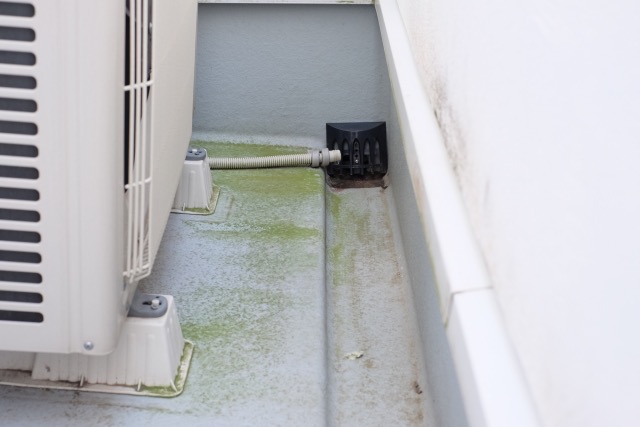 ベランダの床がわずかに傾いて水が溜まる箇所がある場合や、外壁のコーキング部分に水が伝いやすい筋がある場合、常に湿った状態になります。