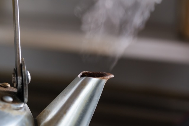 やかんでお湯を沸騰させます。熱いほど効果が高いため、沸騰直後の状態で使用することが理想的です。