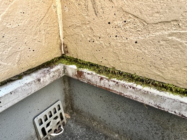 ベランダの隅に溜まった土埃や庭の砂などが雨水で流れ、細かい凹凸に付着すると、それがコケの根付く土台と養分になります。