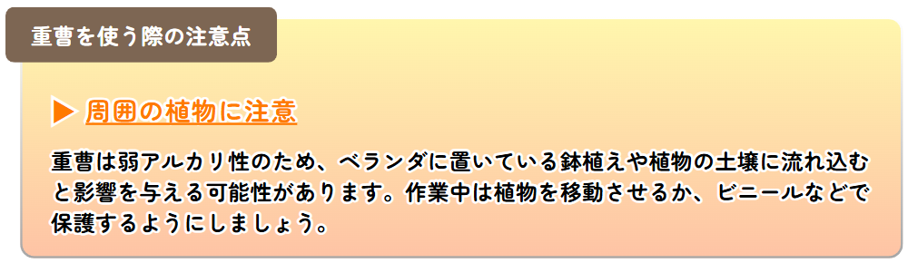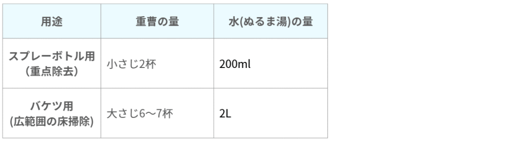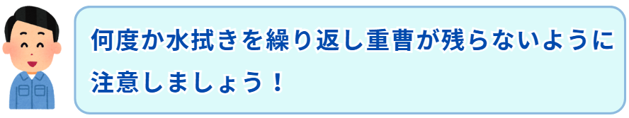 ⚠️ マンション・アパートなど、水を大量に使えない場合は、濡らした雑巾やモップで重曹水を丁寧に拭き取りましょう。