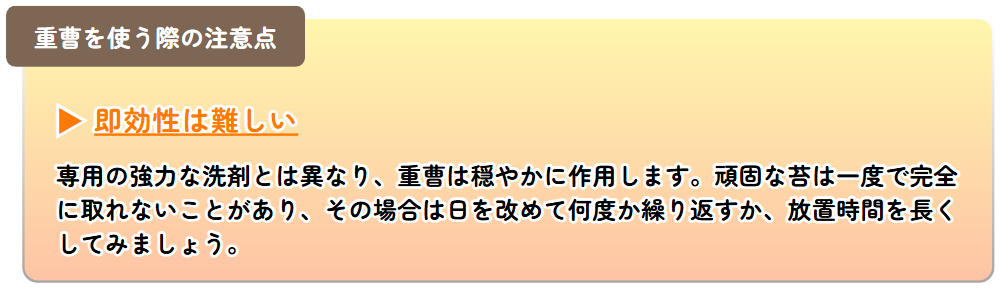 ②. 重曹のアルカリ性と研磨作用により、苔が剥がれやすくなっています。力を入れすぎず、小刻みにこするようにしましょう。