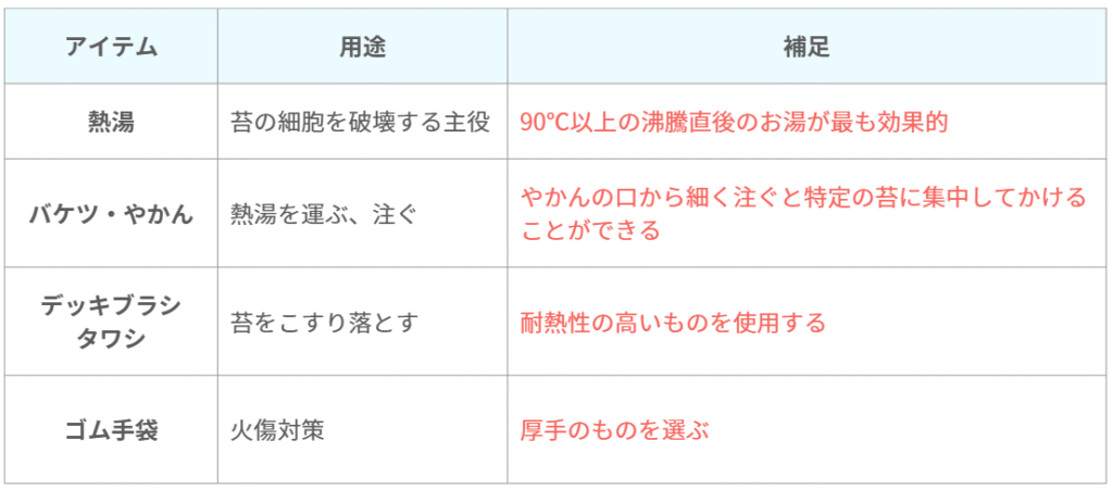 実はご家庭にある道具とちょっとしたコツさえ知っていれば、頑固なコケも意外と簡単に、そして安全にきれいにすることができます。