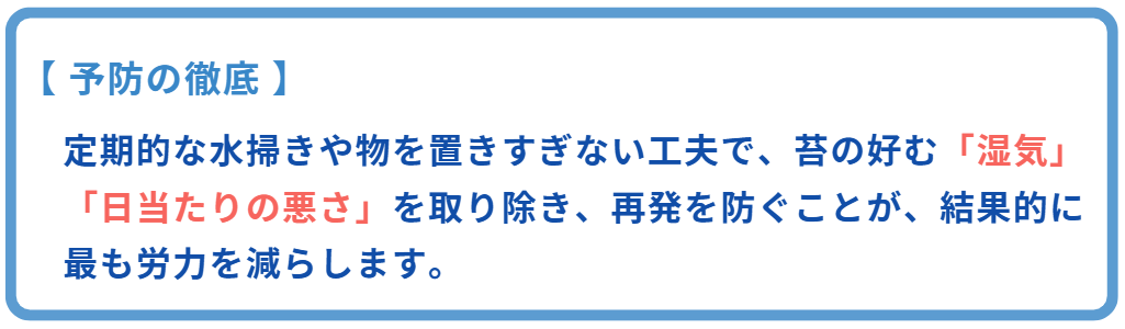 プロの徹底的なクリーニングでリセットした後や、ご自身で重曹や熱湯を使って除去した後も、以下のステップで「 苔が生えにくい環境 」を維持しましょう。