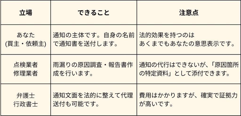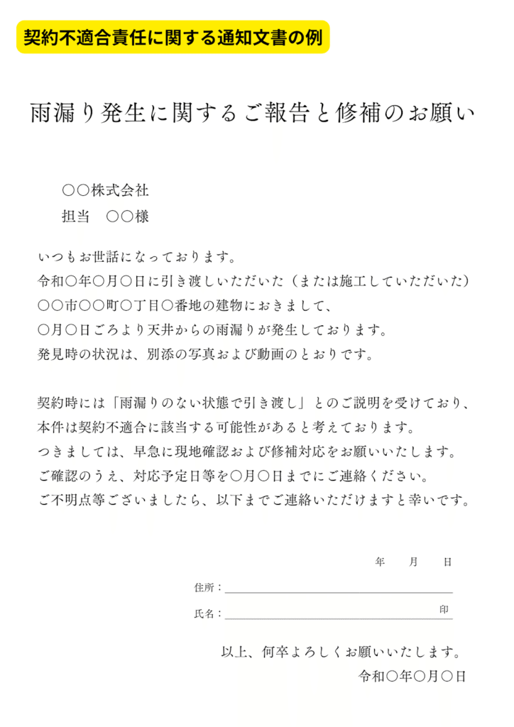 ✅ 通知は「内容証明郵便」またはメール+PDF添付が確実です。書面には発生日・契約日・現象の写真を添付して信頼性を高めましょう。