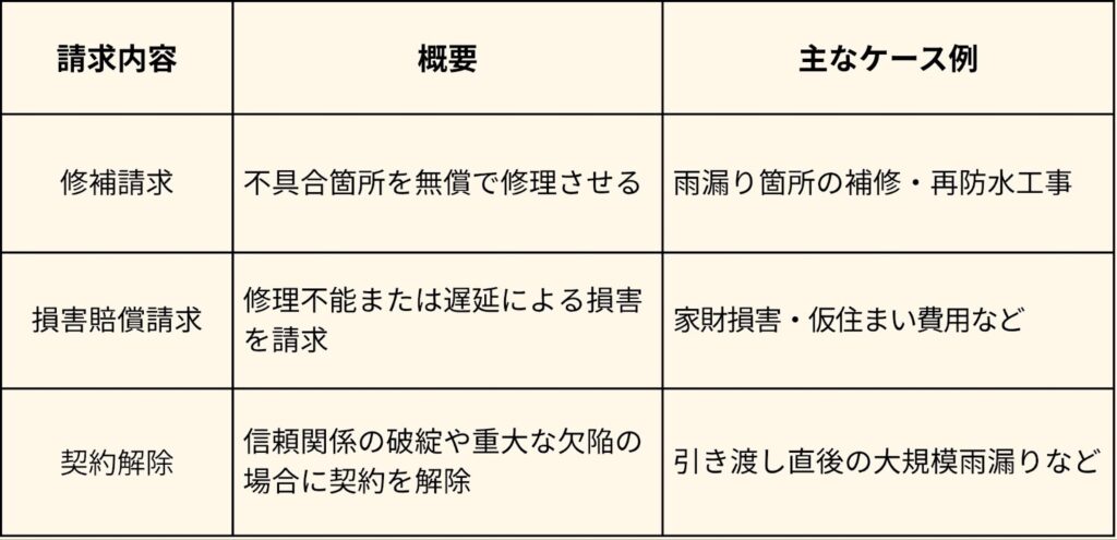 最も一般的なのが「修補請求」です。これは、売主や施工業者に対して「契約内容に合う状態に直してください」と求めるものです。修補費用は原則として業者側の負担です。