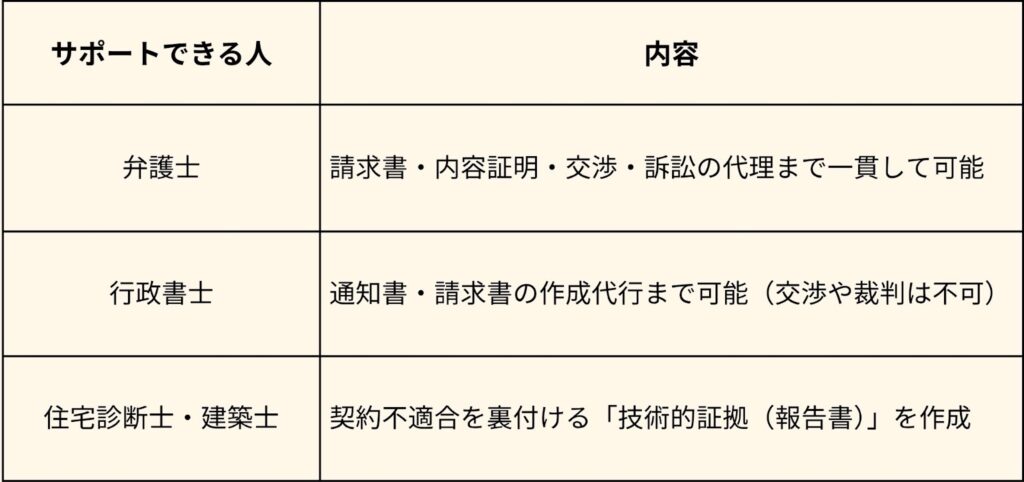 契約不適合責任に基づく請求は、契約の当事者である買主(または工事発注者)本人が行う必要がありますが、サポートを受けることは可能です。