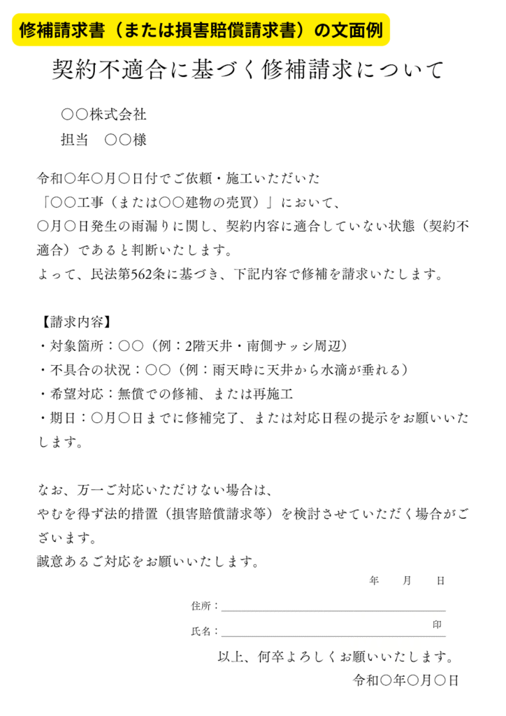 通知同様に、修補請求も口頭ではなく書面またはメールなど証拠が残る方法で行うのが基本です。