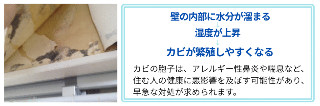 雨漏りが続くと、壁や天井内部にある断熱材が水を吸って劣化してしまいます。断熱材は、一度濡れると乾燥が難しく、断熱性能が失われるだけでなく、カビの温床にもなります。