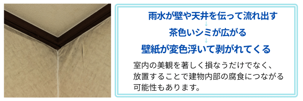 これらの劣化により、わずかな隙間が生じ、そこから雨水が内部に侵入することで、雨漏りにつながります。一度雨水が侵入し始めると、劣化はさらに加速します。
