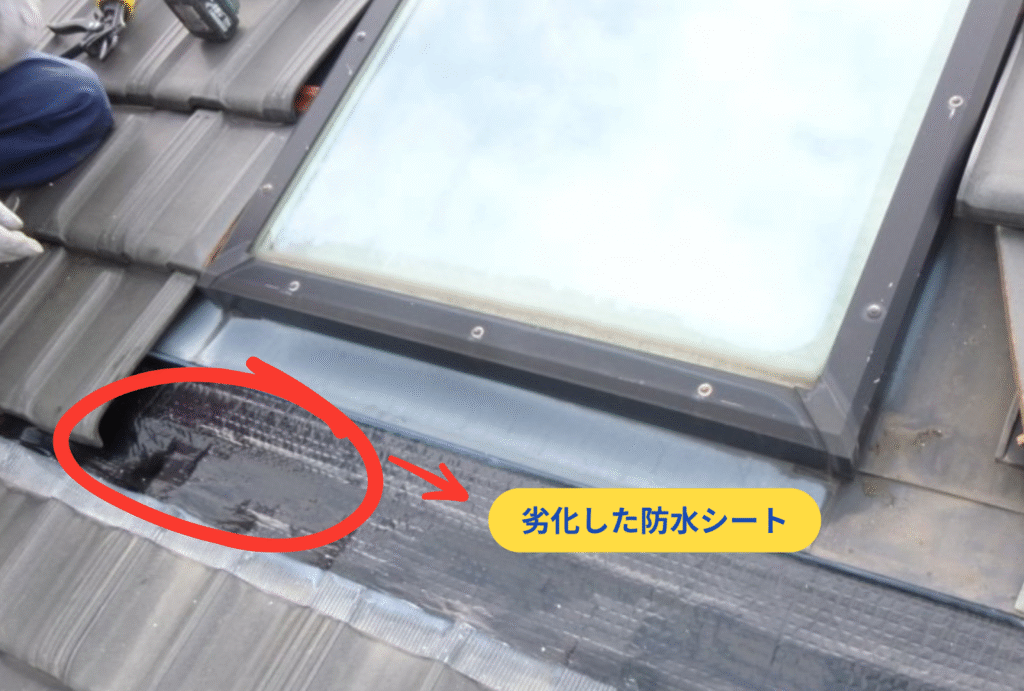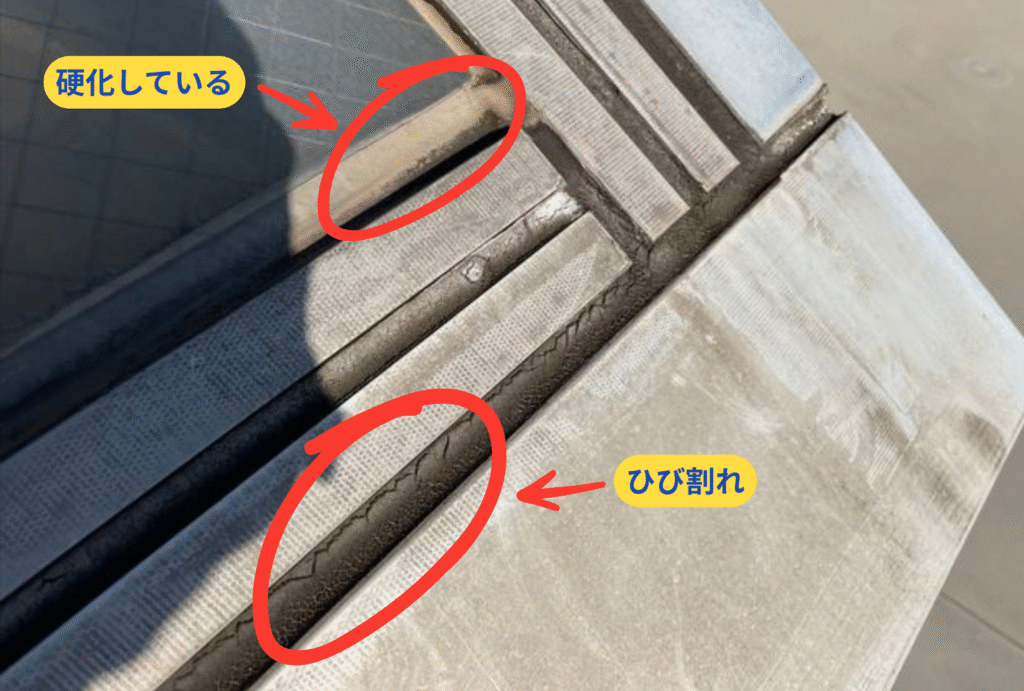天窓のガラスや窓枠の隙間を埋めているパッキン(ゴム製のガスケット)や、窓と屋根材の接合部を防水しているシーリング材(コーキング)は、常に太陽の紫外線と雨風にさらされています。
