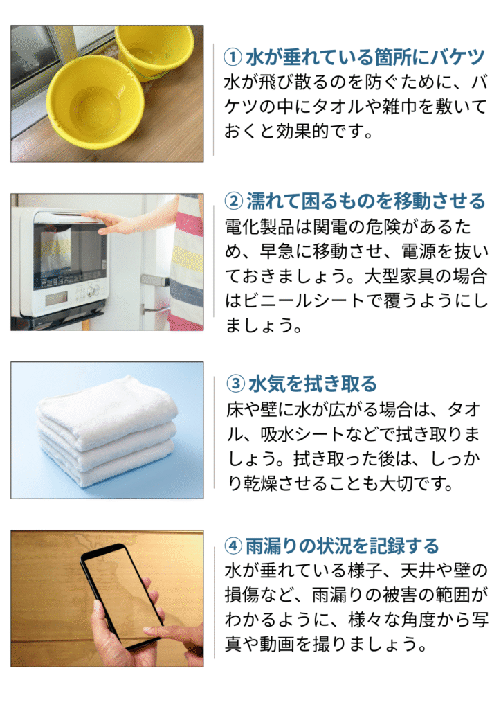 応急処置は、あくまで根本的な修理までの時間を稼ぐためのものです。応急処置を施しても雨漏りが完全に止まるわけではありません。時間とともに効果も薄れていきます。危険な高所作業は避け、安全な範囲で対応しましょう。
