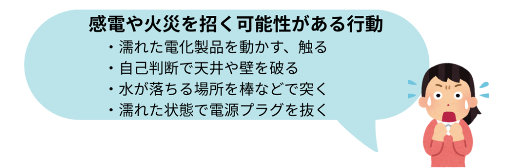 雨漏りが原因で漏電の疑いがある場合、自己判断での対応は大変危険です。濡れた機器や配線には触れず、まずは自分と家族の安全を最優先にする必要があります。