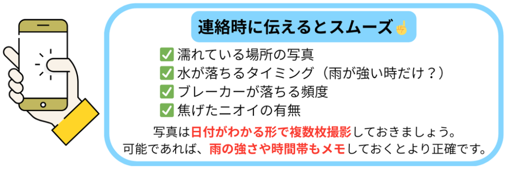 このような行動は避け、安全確保ができたら、必ず専門業者へ連絡しましょう。雨漏り調査と電気トラブルは性質が異なるため、適切なプロの判断が欠かせません。