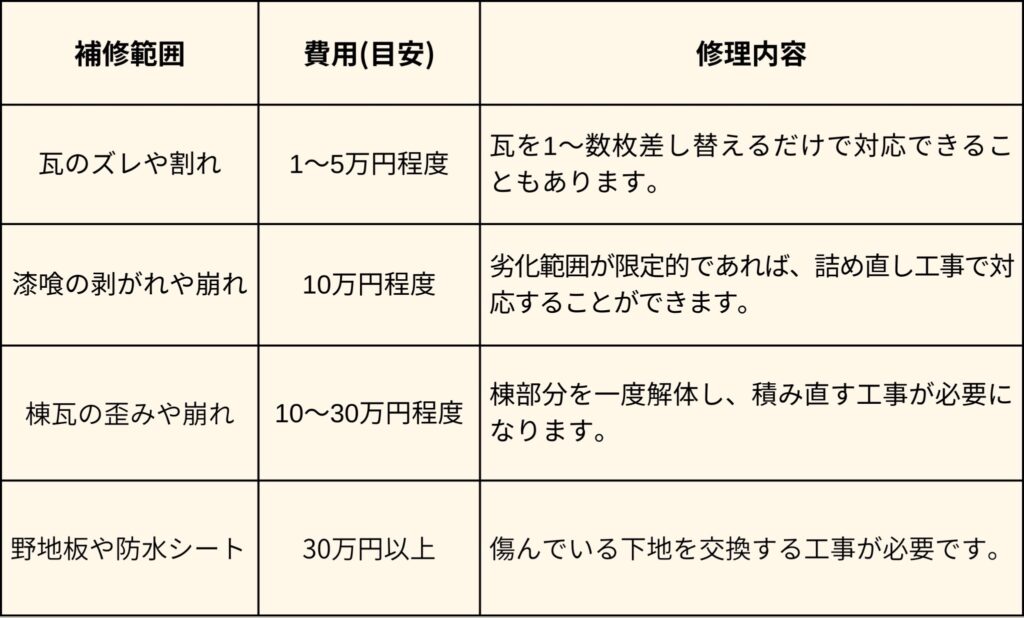 一方で、原因を正しく特定できれば、瓦の差し替えや漆喰補修などの部分修理だけで済むケースも多く、早めの対応が修理費用を抑える大きなポイントになります。放置してしまうと、下地の腐食や雨染みの拡大により工事範囲が広がり、結果的に高額な修理が必要になるリスクが高まります。