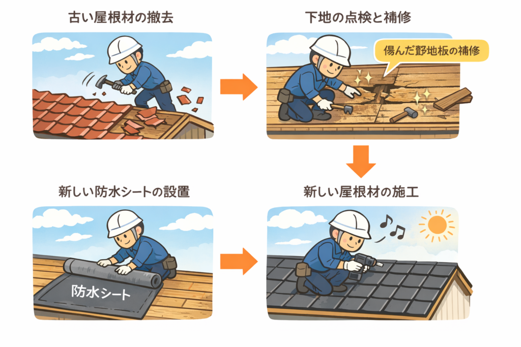 まず古い屋根材を丁寧に外し、その下にある防水シートや野地板と呼ばれる下地部分の状態を確認・補修します。