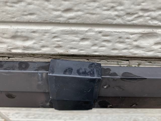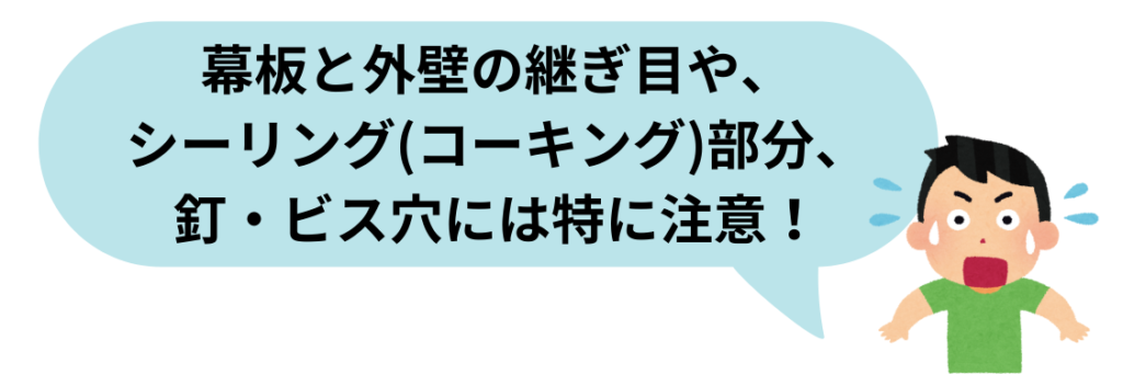 幕板同士の継ぎ目(ジョイント部)を埋めているコーキングが痩せて隙間ができていることがあります。ここから雨水が入り込むと、幕板だけでなく外壁内部まで腐らせる原因になります。