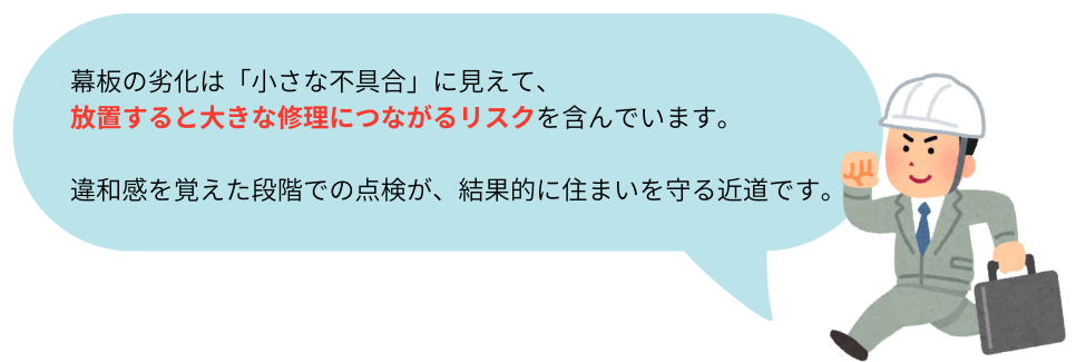 特に注意したいのは、「外壁はまだきれいだから大丈夫」と幕板の劣化を見逃してしまうことです。幕板は外壁よりも先に傷みやすく、表面だけを補修しても、内部まで劣化が進んでいれば再発や雨漏りの原因になります。見た目だけで判断せず、構造や雨水の流れを含めて点検することが、被害を大きくしないためのポイントです。