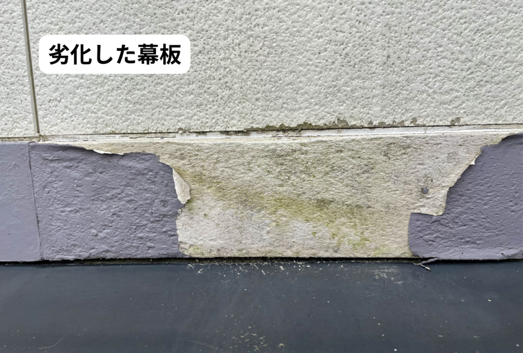 幕板は外壁の途中に水平に取り付けられているため、構造上とても雨水が集まりやすい部材です。屋根や上階の外壁を伝ってきた雨水が、ちょうど幕板の上部でせき止められ、雨だれとなって集中します。その結果、他の外壁部分よりも常に水分にさらされやすく、劣化が早く進行しがちです。