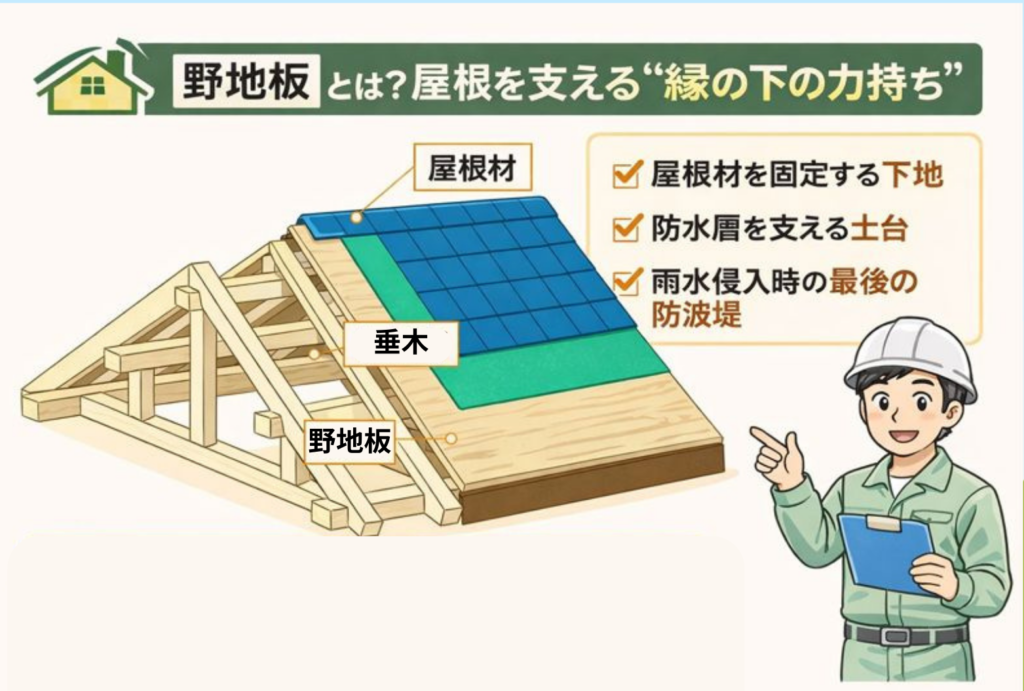 屋根の雨漏りや劣化を考えるうえで、実はとても重要なのが「野地板(のじいた)」の存在です。野地板は屋根材のすぐ下に隠れているため、普段の生活では目にすることがほとんどありません。