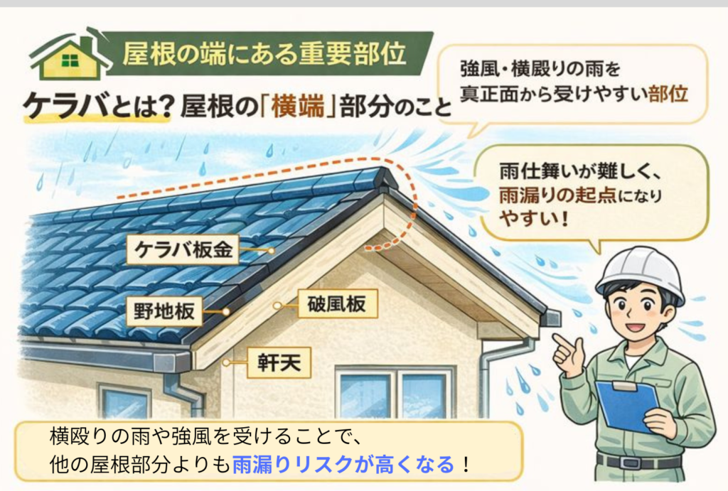屋根の中でも「ケラバ」は、雨漏りの原因になりやすい重要なポイントです。しかし、その名前や役割を正しく理解している方は意外と多くありません。屋根の横端にあたるケラバは、風雨を真正面から受けやすく、構造的にも雨仕舞いが難しい場所です。
