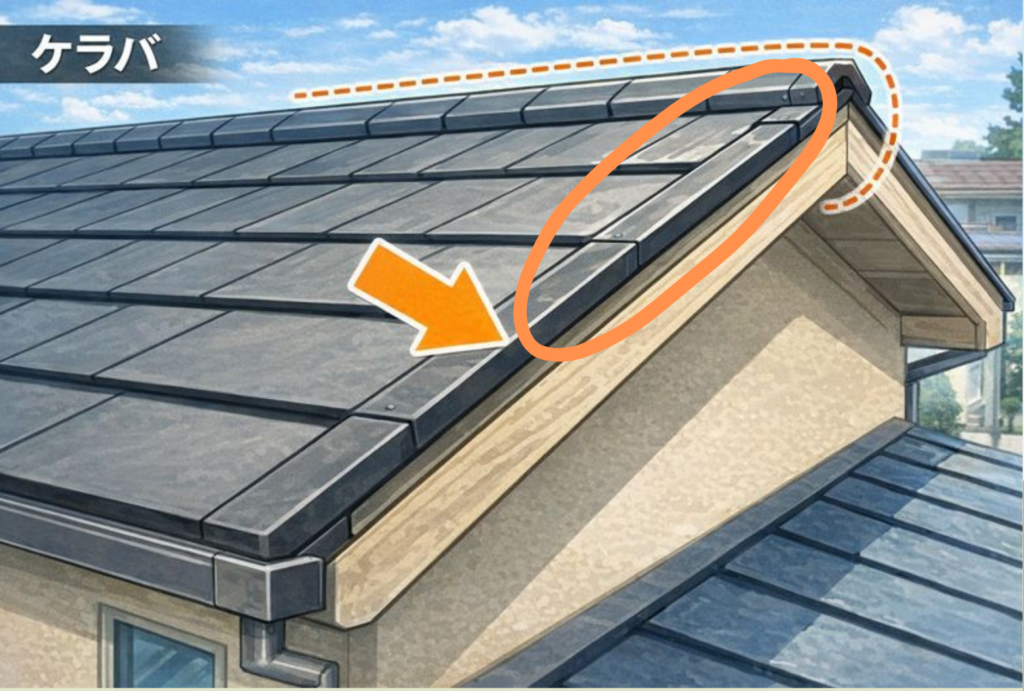 ケラバは屋根の中でも雨や風を真正面から受けやすい場所です。特に横殴りの雨や台風時の強風では、屋根材の隙間や板金の継ぎ目に雨水が入り込みやすくなります。そのため、他の屋根部分よりも雨仕舞い(雨水を内部に入れない処理)が難しい構造といえます。