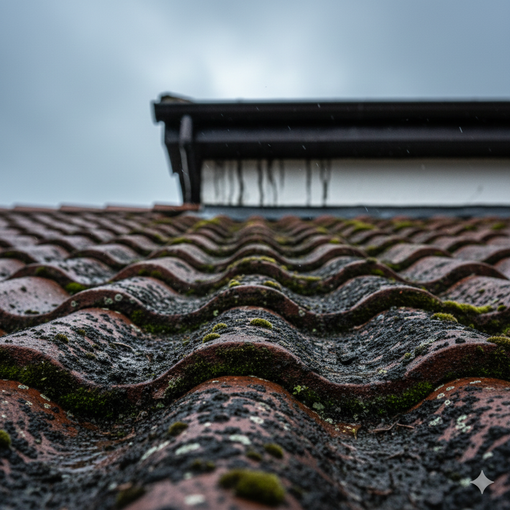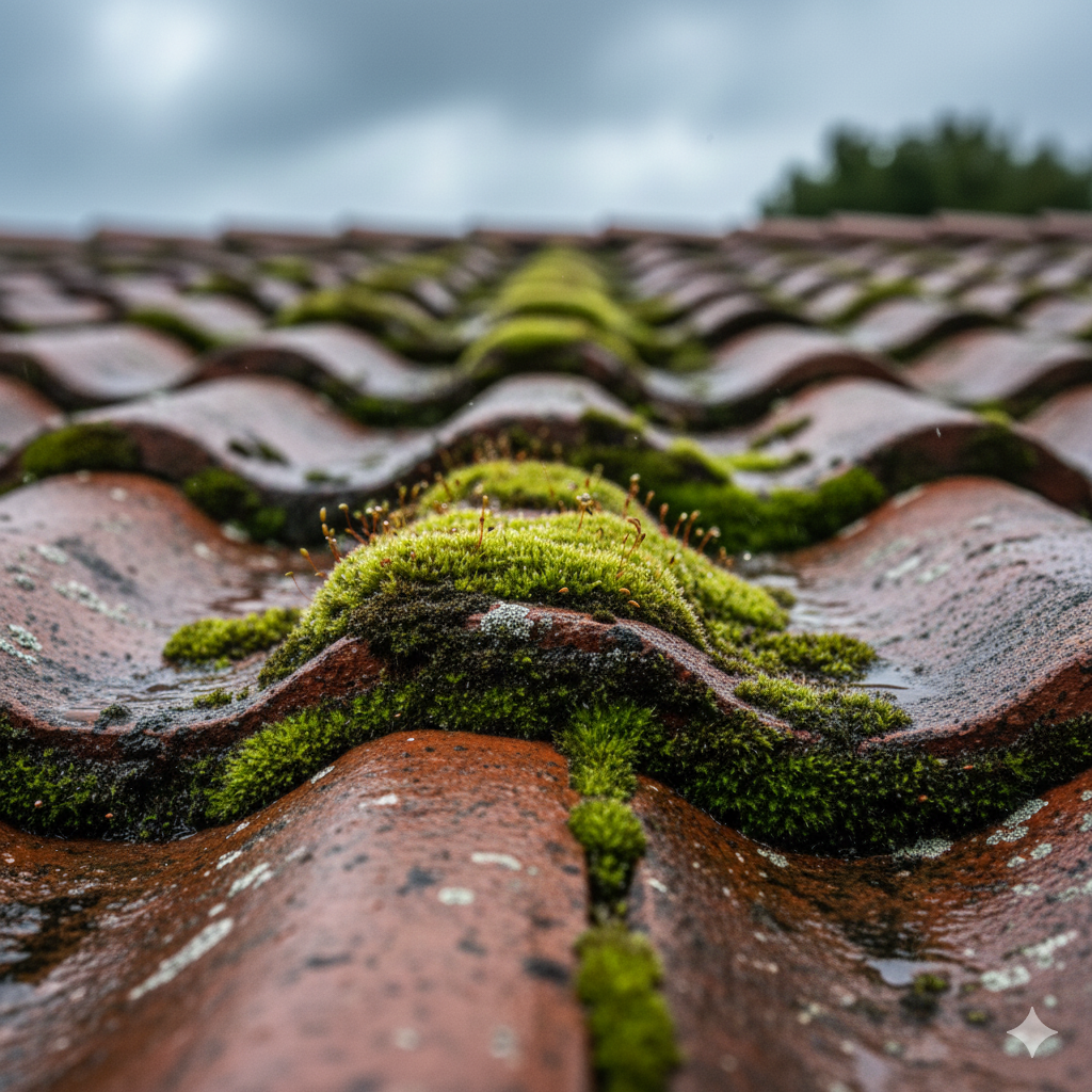 屋根に生えたコケは、いわば水分を溜め込む『湿ったスポンジ』のようなものです。これが排水の邪魔をして、雨水の逃げ道を塞ぐため、瓦の隙間から水が逆流し、雨漏りの直接的な引き金になります。