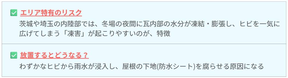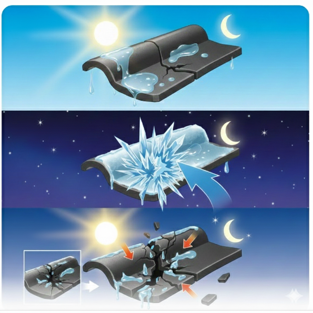 冬場の夜間に凍り、昼間に溶ける。瓦に染み込んだ水分が凍って膨張することを繰り返すと、瓦の内部からひび割れ(クラック)が発生します。