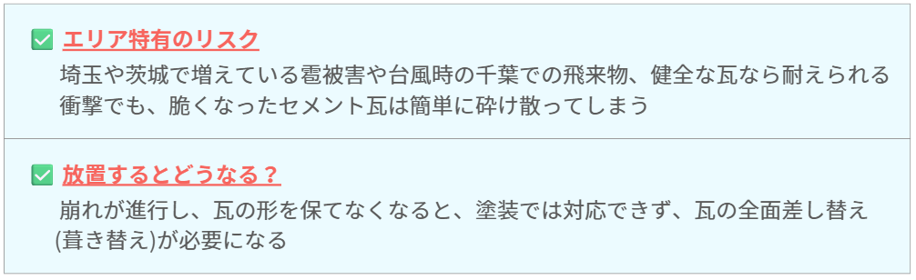 特に千葉県・埼玉県・茨城県エリアは、冬の湿った重い雪や夏場の強い直射日光など、屋根にとって過酷な環境下にあります。塗装が剥げたセメント瓦は、スポンジのように水を吸い込み、冬の寒さで凍って割れたり、内部の腐食を招いたりします。
