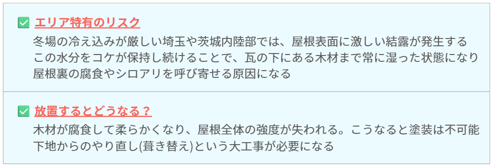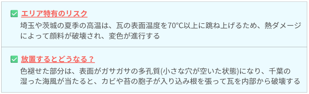 これらを放置することは、千葉県・埼玉県・茨城県の厳しい季節風や湿気に対して、住まいの防御壁(瓦)を腐らせて雨漏りを招いている状態になります。