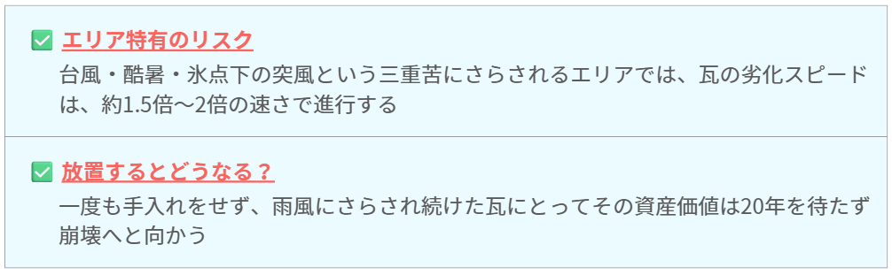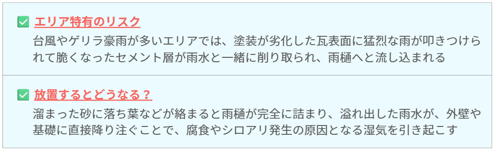 このエリアは、台風や突風も多いため、小さなヒビを放置すると、強風時にそこから瓦が割れて、飛散する二次災害のリスクもあります。