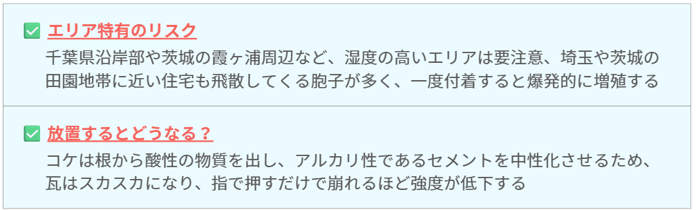 千葉県や茨城県の沿岸部や、水田の多い埼玉県の地域では、湿気が溜まりやすくコケやカビが発生しやすい傾向にあります。